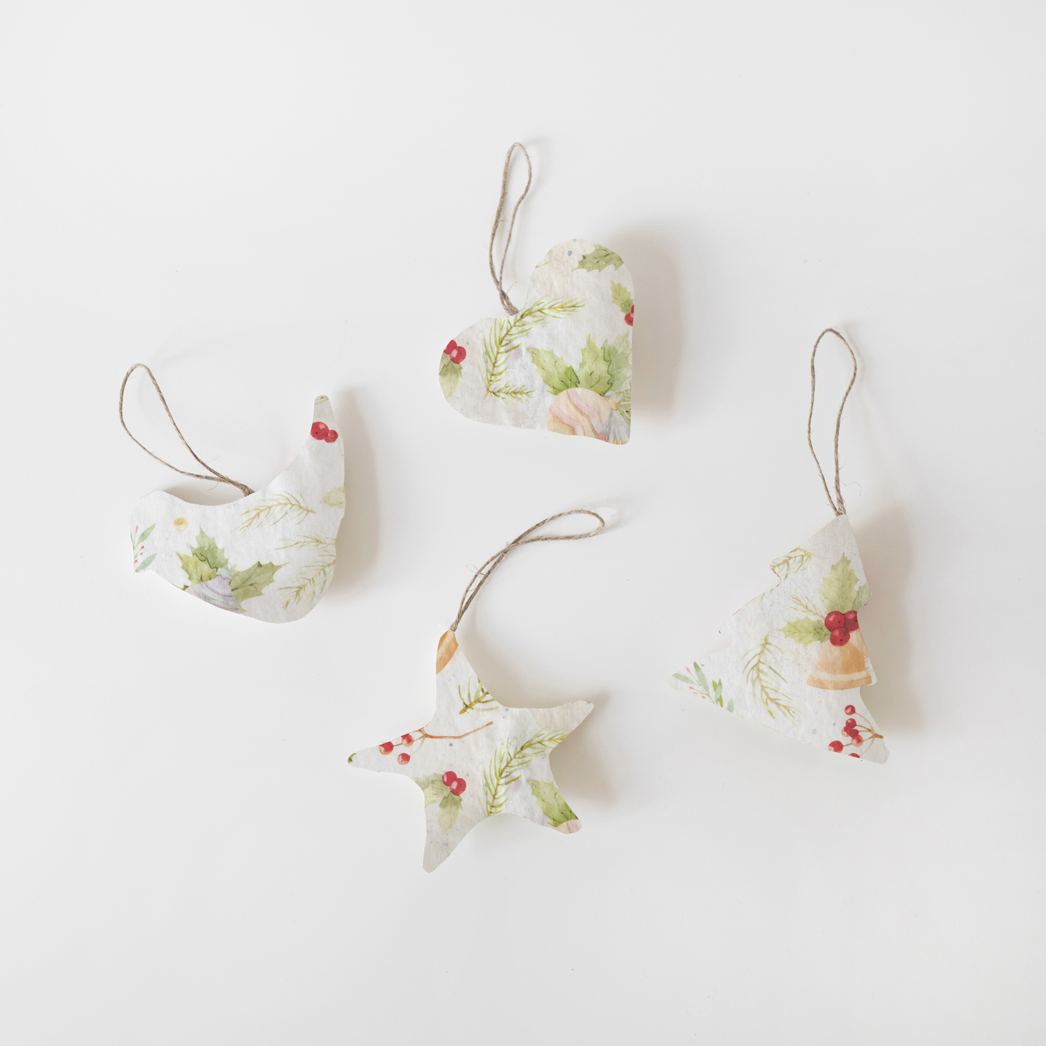CHRISTMAS PRINT ON WHITE SET OF 4 CHRISTMAS TREE DECORATION