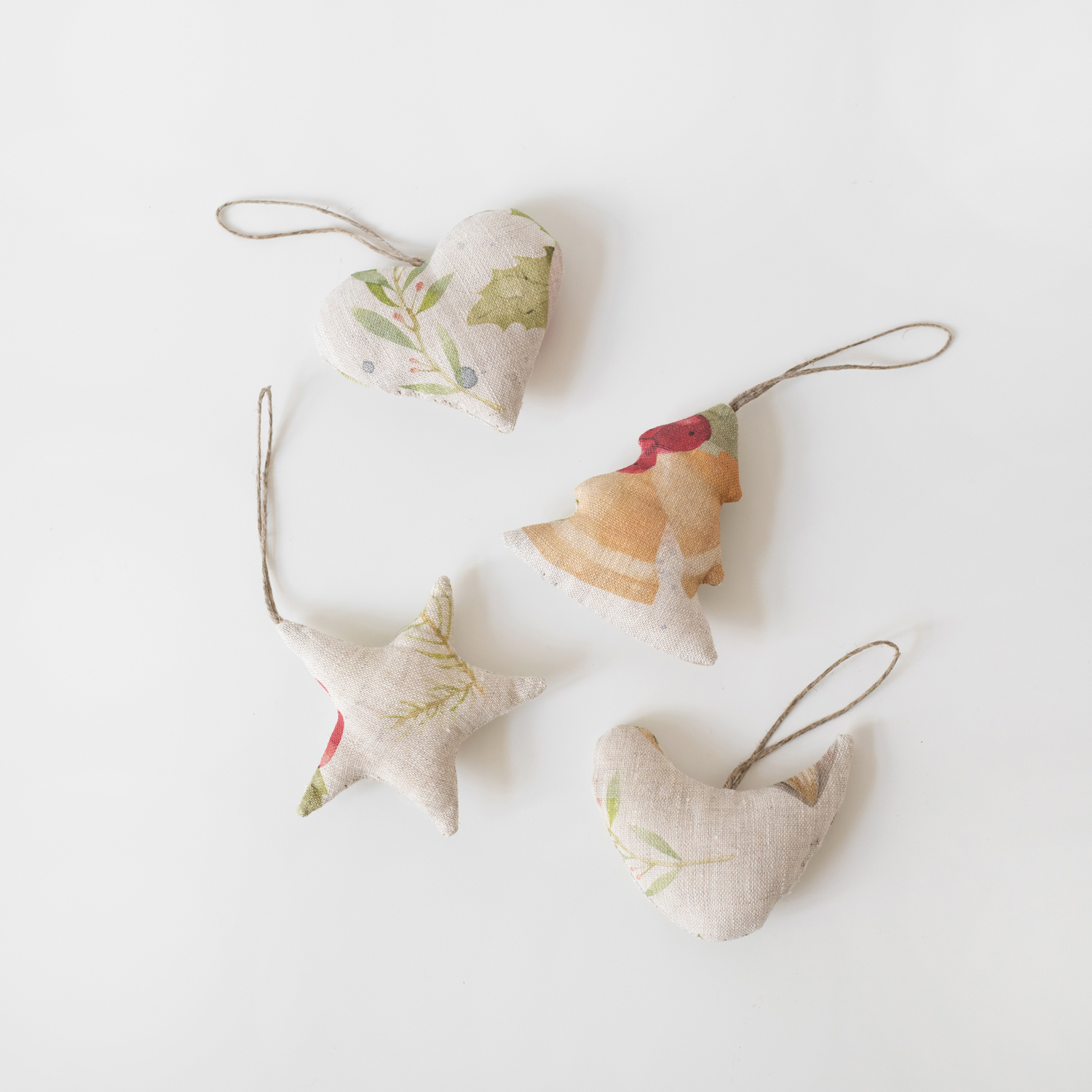 Christmas Print on Natural Set of 4 Christmas Tree Decoration